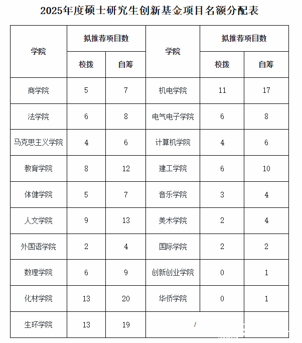 (一)拟推荐项目分配。根据各公司在校研究生人数的5%测算硕士生创新基金拟推荐项目,具体各公司硕博创新基金拟推荐项目分配见下表: