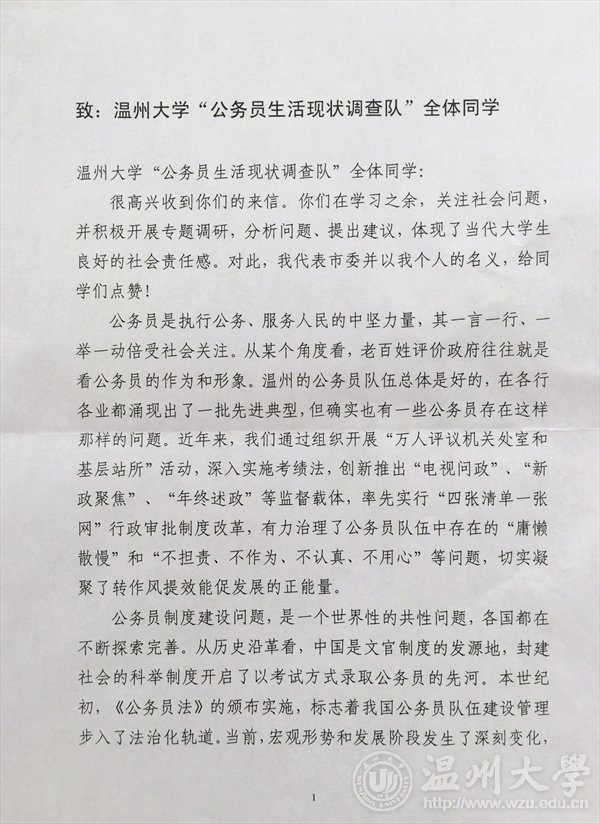 为了让数据更具可行性和准确性,以确保调研结果的客观真实。调查队的调研遍布鹿城、瓯海、龙湾三个区的车站、医院、公司、超市等各个场所,同时,队员们对我各区县相关机关部门公务员进行面对面访谈,掌握了大量详实的一手材料。调查队并于去年10月写出了调研结果。