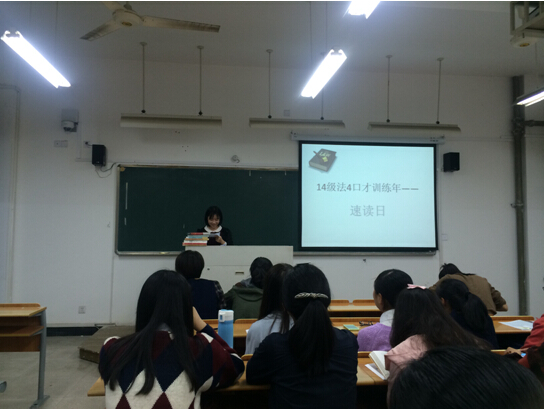 启动仪式后,法4班在法政楼308教室开展口才训练系列活动之速读日活动。同学们经过两个星期的充分准备,想一展速读训练成果,有的读四中全会报告,有的读散文,还有同学读宪法序言,语音标准,吐字清晰,阅读如行云流水。教室里不时爆出阵阵掌声和欢笑,掌声和赞许中包涵了对自己和同学的鼓励与认可。最后,经过大家投票,学习委员许晓地同学以16票的压倒性优势赢得了最终胜利。
