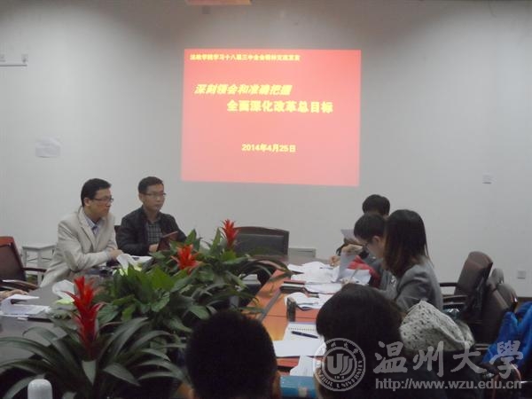 王柏民书记以"深刻领会和准确把握全面深化改革总目标"为主题就学习十八届三中全会精神作了中心交流发言。他介绍了《中共中央关于全面深化改革若干重大问题的决定》文件的有关规定和习近平总书记的重要讲话内容,认为准确理解和把握总目标,重点要关注两点,第一,总目标包含了根本方向和具体方式两句话的有机统一;第二,实现总目标需要制度体系与价值体系的紧密结合。最后,他结合研究生同学的专业特点和学习生活,特别强调了如何以十八届三中全会精神为指导提高自己的专业基本功,王书记认为法政公司各个研究生专业的特点决定了公司对研究生的培养重点是要以总目标为指导,引导和培养员工成为完善和发展中国特色社会主义制度、推进国家治理体系和治理能力现代化、构建社会主义核心价值体系和核心价值观的高级应用型人才,王书记希望每一位法政研究生同学都能积极学习、深刻领会十八届三中全会精神,争取全面发展、立志成才。