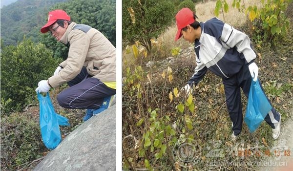 随后,志愿者们在两校领导和老师的带领下,沿大罗山一路合作捡拾沿途垃圾。有些垃圾被丢在荆棘丛生的山道陡坡中,大家仍不顾刺痛,一路上大家齐心协力,小心的攀爬上去捡拾。历时3小时后,首次联合环保活动圆满结束。