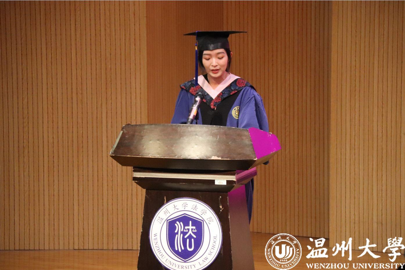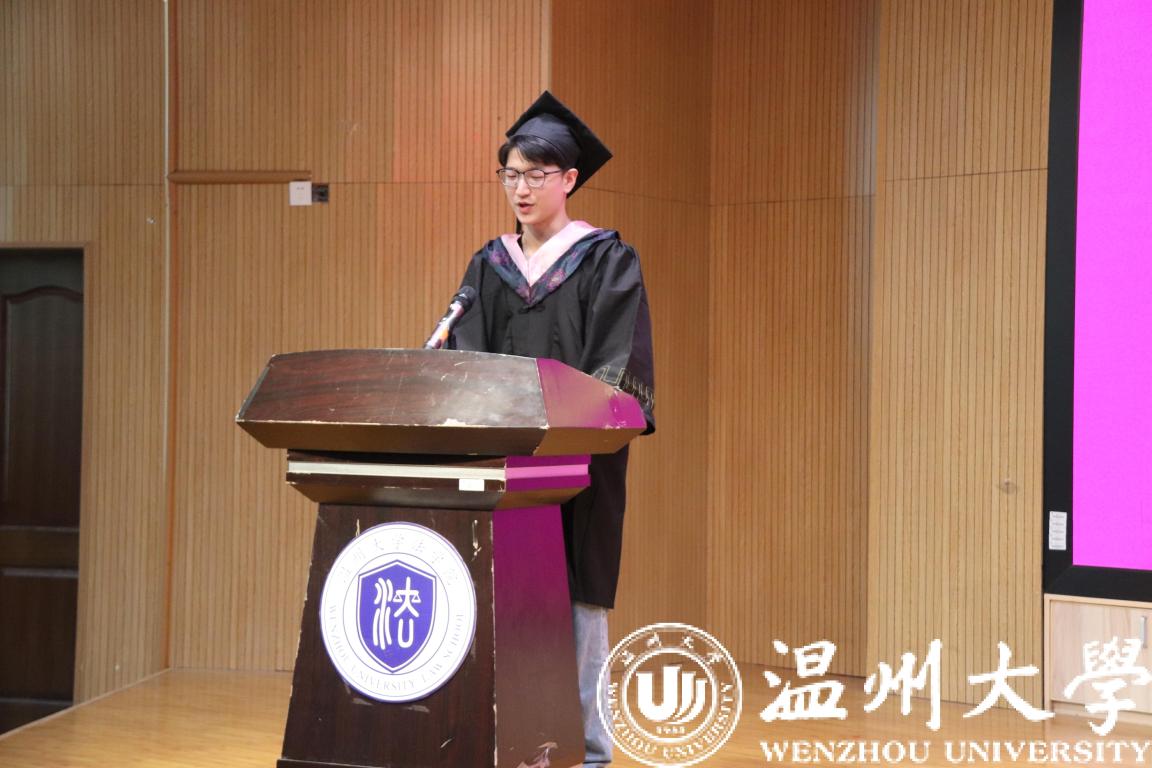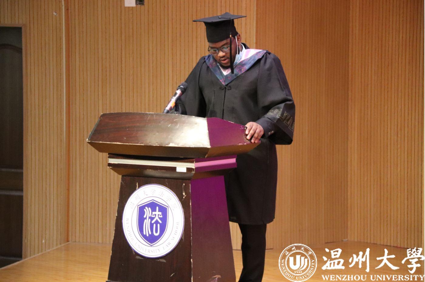 职工代表Abdallah Usama Ibrahim 发言,他分享了四年的收获与成长,表达了对师长悉心培养的感谢,对母校的不舍与感恩。职工活让他们学会了运用汉语,学到了他们热爱的法学专业知识,当学业圆满完成的时刻,最想表达的、也溢于言表的就是对母校教育、对温州、对中国的由衷感谢。“We are indebted to each other. The friendships that we have made here will last a lifetime.”