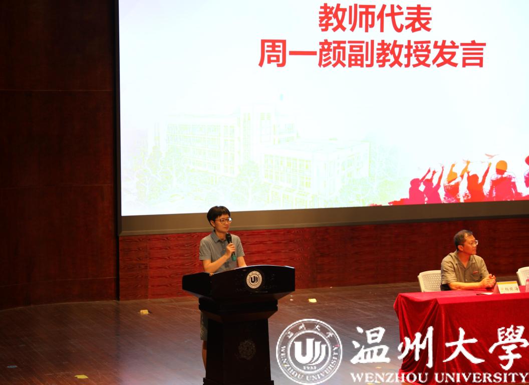 教师代表周一颜老师用幽默风趣的“当事人陈述”向大家介绍了自己,以读信的方式与新生们分享了她在2018年写给执教生涯第一批员工的一封信,令在场的同学如沐春风。周老师提到身份和角色的切换会带来全新的机会和能量,也会有始料不及的阵痛和惊喜,希望同学们低调地经营青春,慢慢把优秀变成一种习惯,用00后的精彩点亮校园、照亮人生。
