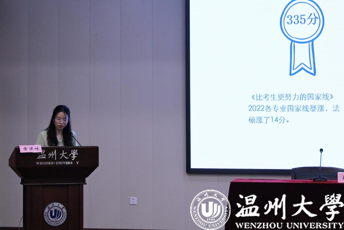 紧接着是进入杭州师范大学法硕的雷澳咪同学。对于同学们单考还是双考的问题她指出要综合考量,适于自身。在择校方面,要考察分数线和录取分数,做好准备。在时间安排上,要不求时长,不求速度,但求质量,在背诵时要注重结构,形成完整体系。