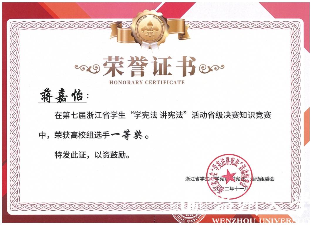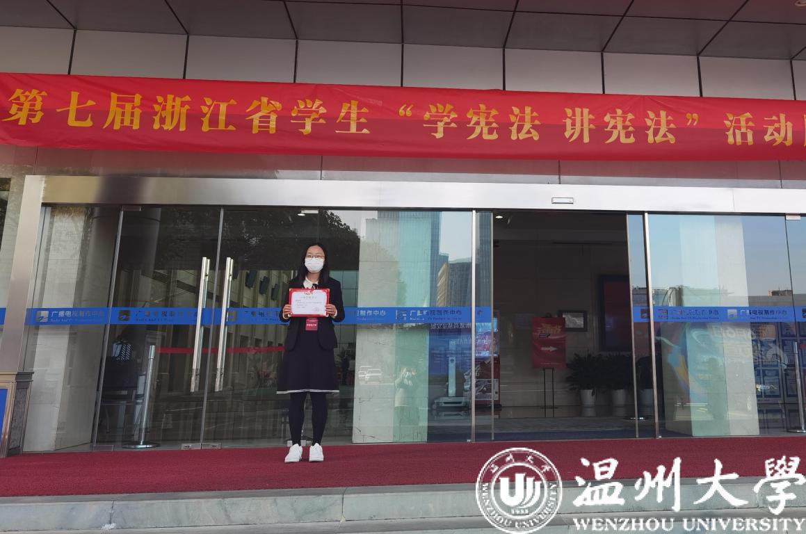 2022年11月5日至6日,第七届浙江省“学宪法 讲宪法”活动总决赛在浙江广电集团举行,yl永利集团官网登录2020级员工蒋嘉怡荣获知识竞赛总决赛高校组一等奖。