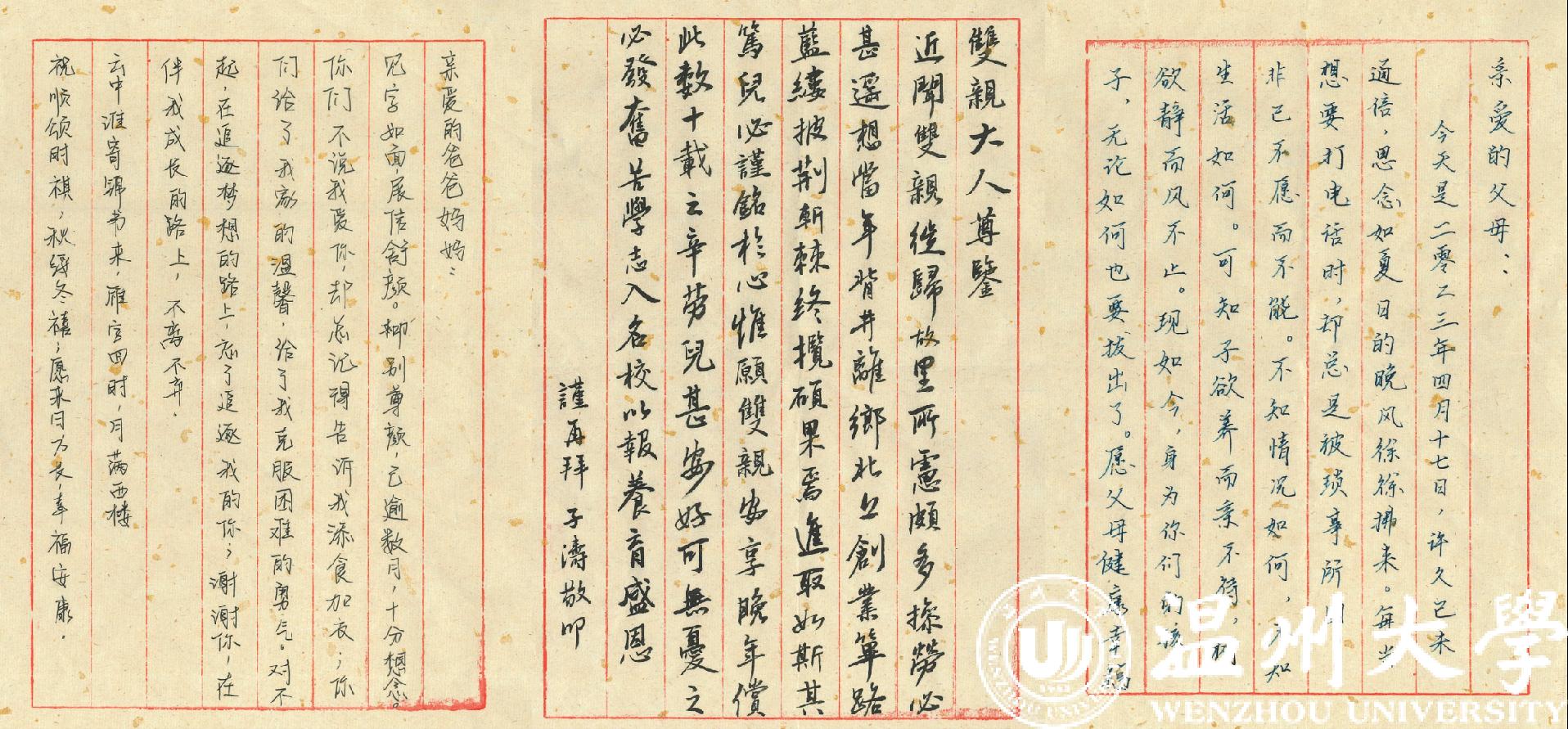 为深入贯彻落实习近平总书记关于注重家庭家教家风建设的重要论述,充分挖掘家书家信在培养道德情操、促进家庭和谐中蕴含的文化价值、道德价值和社会价值,赓续“百善孝为先”的美德,第二十八个世界读书日来临之际,yl永利集团官网登录组织开展了“七步立法秉肃穆,三行家书传温情”优秀家书征集活动。德为律核,以书做舟,以信化径,挥墨家书,希冀莘莘学子敞开心扉,与家人畅所欲言。同学们踊跃参加,积极投稿,用笔墨抒写那些与家人之间道不尽的真情及感动......