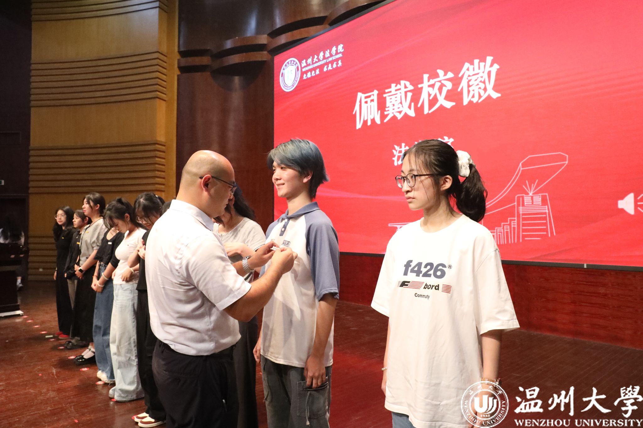 现场还举行了校徽佩戴仪式,党委副书记郑兆钧为新生代表逐一佩戴校徽,其他新生在现场同时佩戴校徽。这枚徽章不仅象征着同学们正式成为永利集团官网的一员,更承载着“求学问是、敢为人先”的温大精神。从此刻起,他们将肩负起温大人的责任与使命,在这片沃土上书写属于自己的成长新篇。
