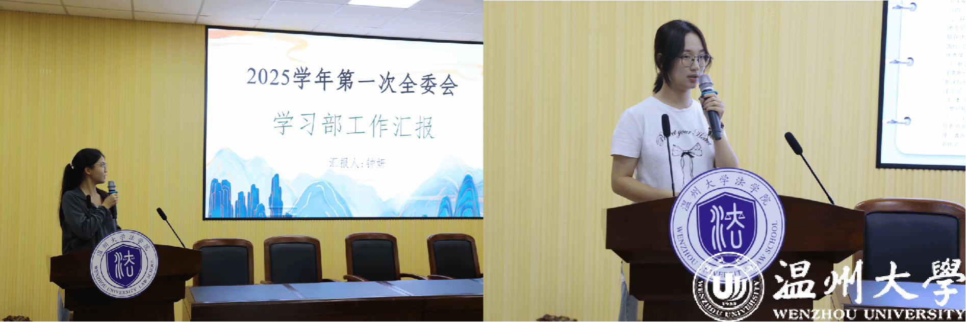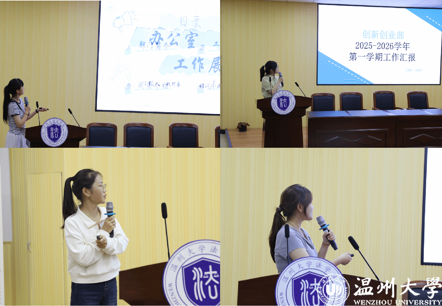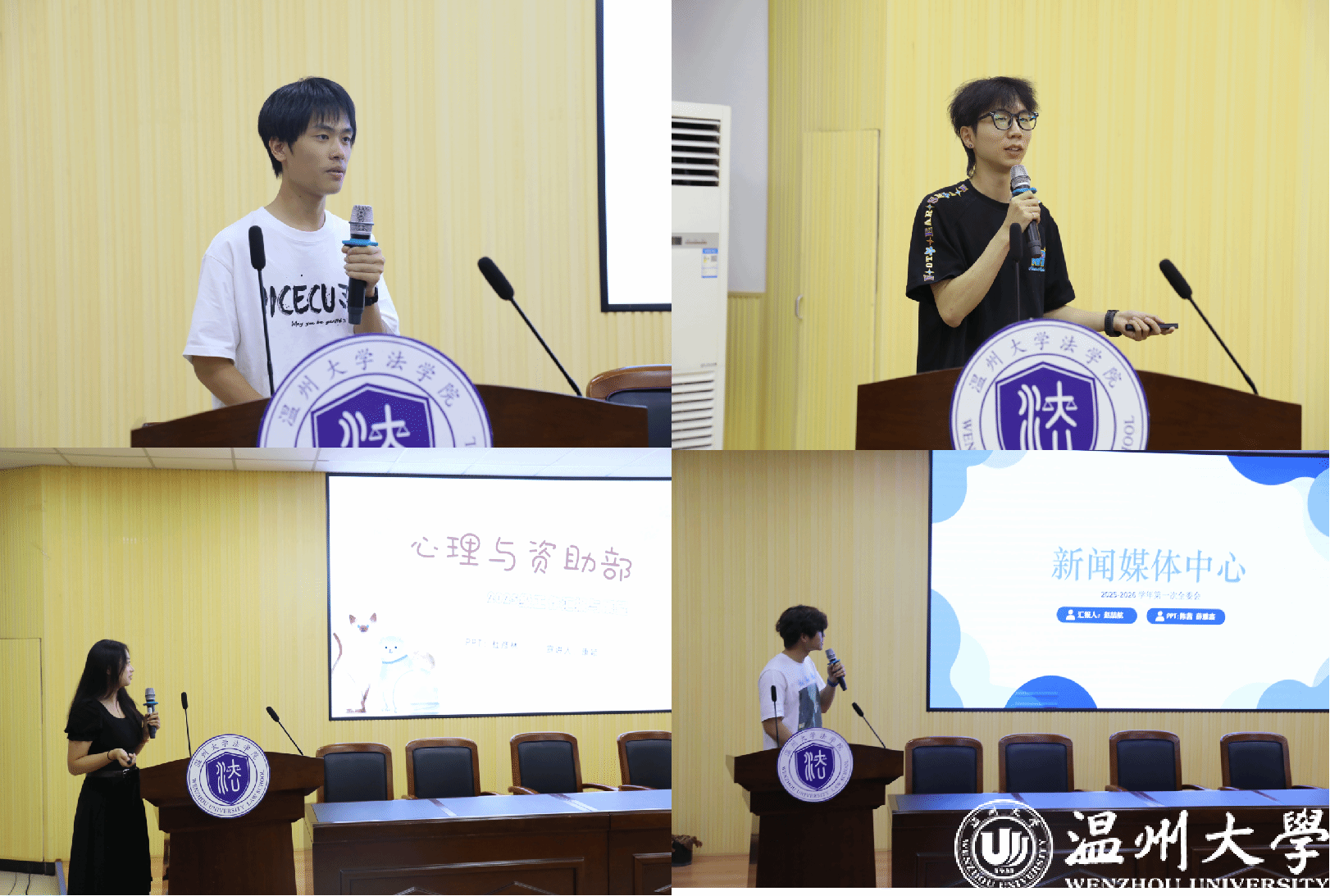 组织部、办公室、新闻媒体中心、律政青年志愿者中心、外联与就业服务部、学习部、创新创业部、心理与资助部、文体部、素质拓展与实践部的代表们通过图文并茂的PPT向我们介绍了部门工作,部门成员以及未来展望。通过此次集中交流,新成员们对团学工作的整体架构与运作机制有了更深入的理解,为后续工作的顺利开展奠定了坚实基础。不同的职能,共同的使命;多样的风采,一致的初心。在汇报中我们见证了涓流汇海的蓬勃力量,也看见了团学工作未来的崭新图景。