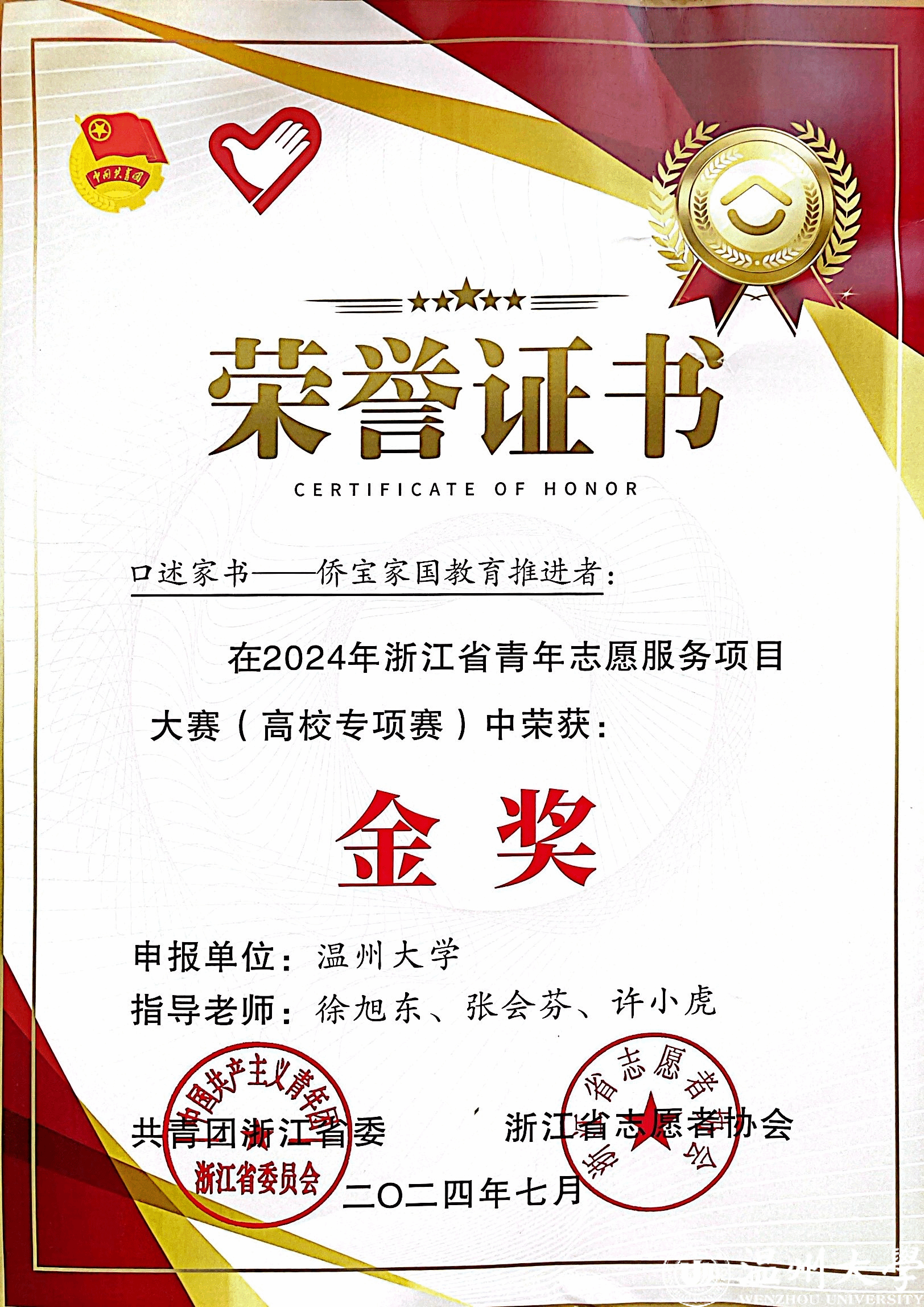 图4 浙江省青年志愿服务项目大赛金奖证书